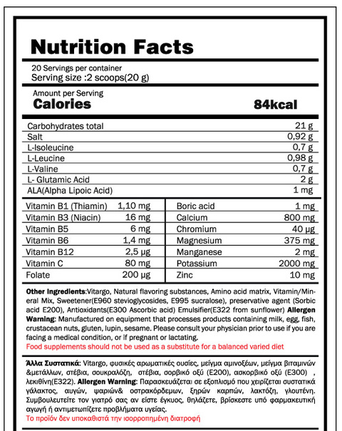 Το Vitargo® είναι ένα μοναδικός, πατενταρισμένος υδατανθράκας, υψηλού μοριακού βάρους ειδικά σχεδιασμένος για αθλητές, καθώς αποτελεί μια πραγματικά αποτελεσματική πηγή ενέργειας, που αυξάνει την παροχή γλυκογόνου στους μύες, είναι άμεσα απορροφήσιμο και βοηθά στην ανάπτυξη μυών καθώς και στη βελτίωση των επιδόσεων.